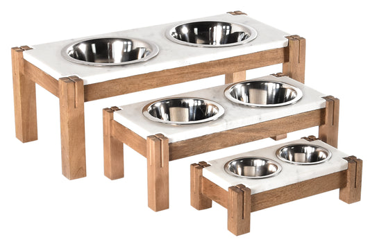 This feeder comes in different sizes to accommodate pets of all breeds. With a durable marble top with two inset stainless-steel bowls, this feeder will make their meal time happy.
