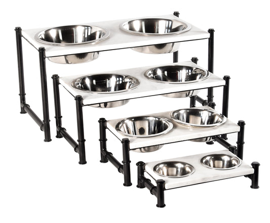 Crafted using a white marble top contrasted with bold black iron piping, the feeder is perfect for urban pet parents looking for a minimalist structure.