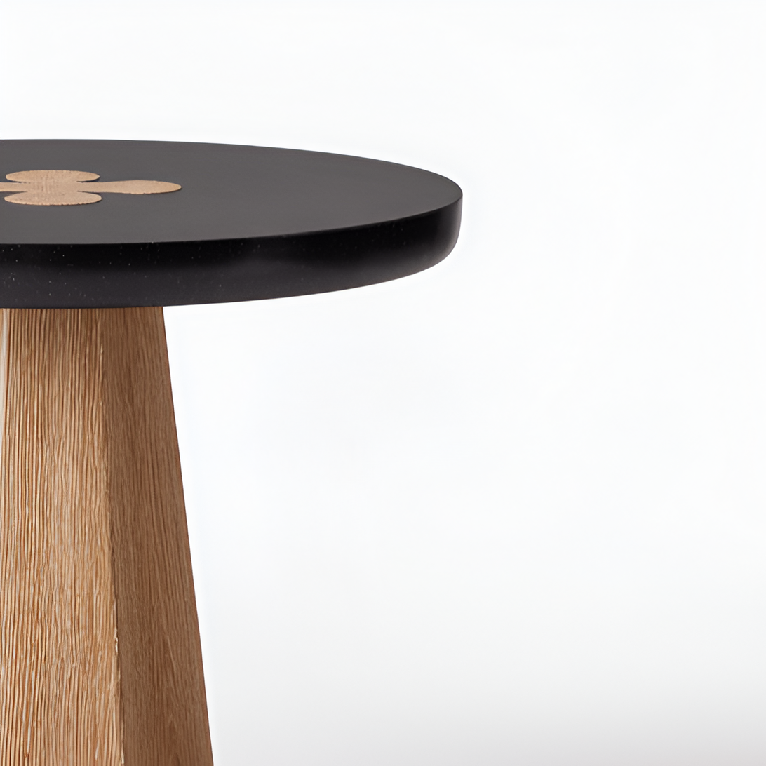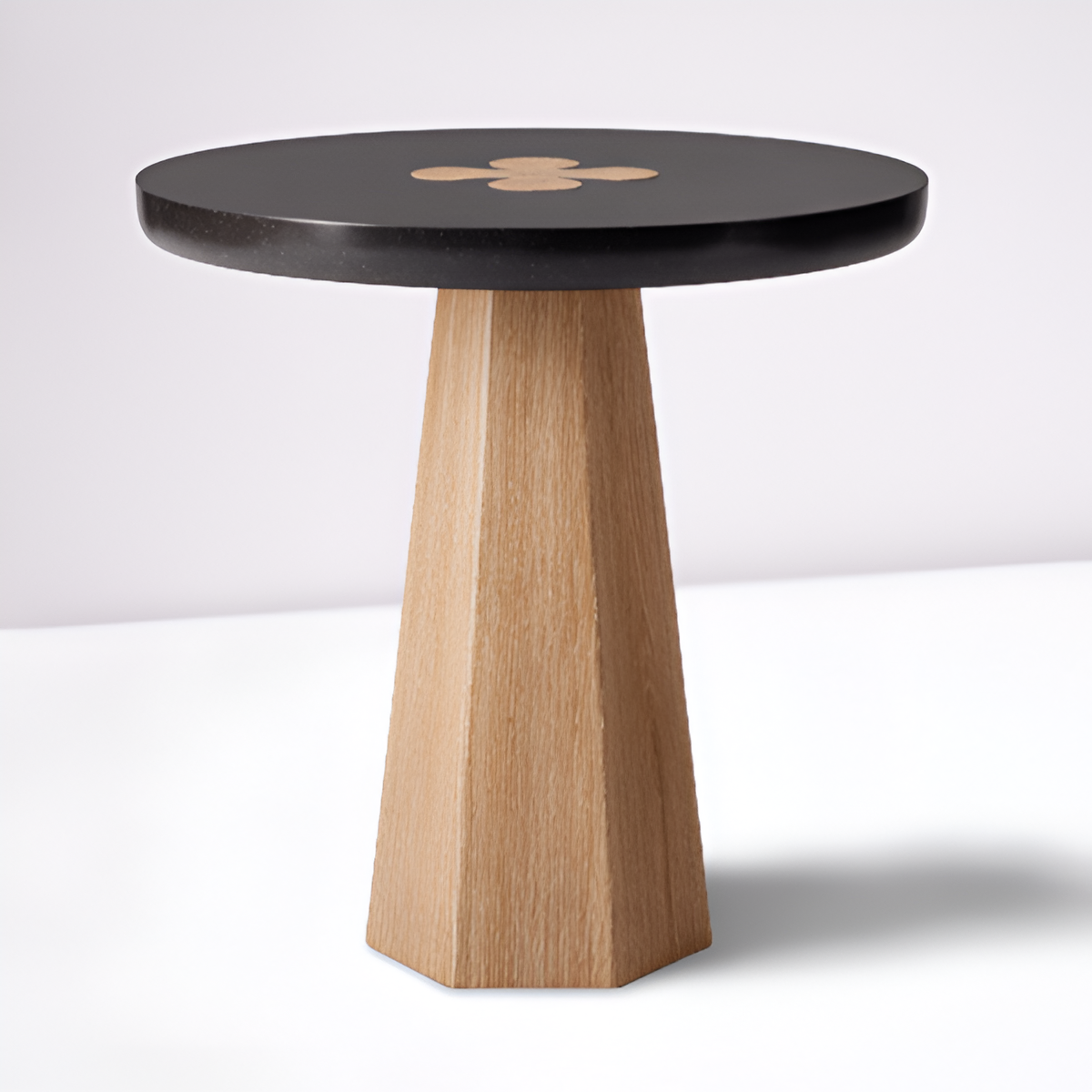Sculptural geometry meets refined contrast in Alvoro. The side table features a round black top with an inlaid clover motif in natural wood, adding a subtle decorative accent. Its faceted pedestal base, crafted from solid oak, introduces bold structure and artisanal craftsmanship. The interplay of dark surface and warm wood creates a striking yet versatile piece that blends modern design with timeless character. Perfect beside a sofa, lounge chair, or as a standalone accent, Alvoro lends sophistication and sculptural charm to any living space.