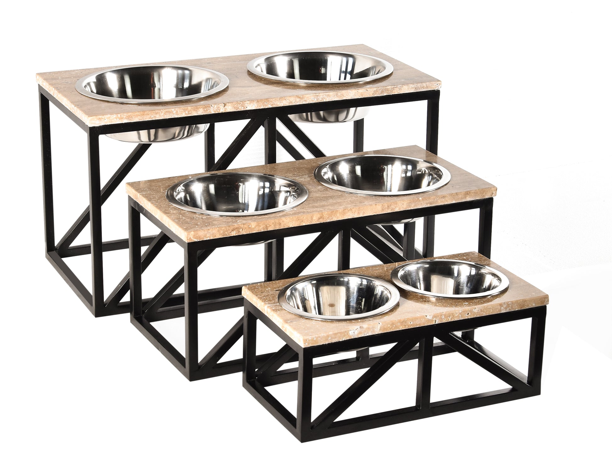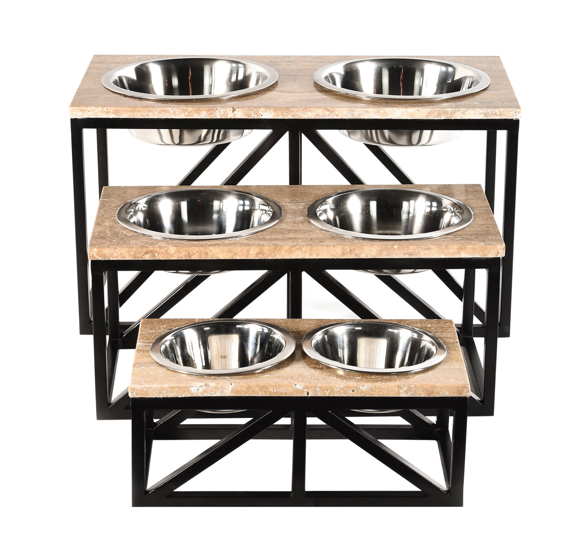 Each size features a refined geometric base handcrafted from robust iron in a matte black finish, supporting a natural marble slab that brings timeless elegance to any room. The raised design promotes better posture and digestion for your pets, while the removable stainless-steel bowls ensure easy cleaning and hygiene.