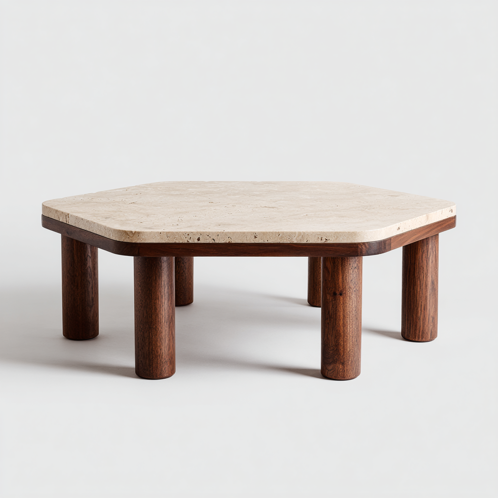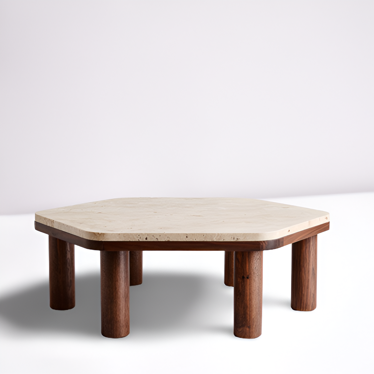 Sculptural form meets timeless materiality in Calviano. The coffee table features a distinctive hexagonal travertine top, its softly rounded edges showcasing the stone’s natural warmth and organic character. Supported by six cylindrical solid wood legs, the design offers a bold architectural presence while maintaining an understated elegance. The interplay of earthy stone and rich wood grounds any living space with quiet sophistication.