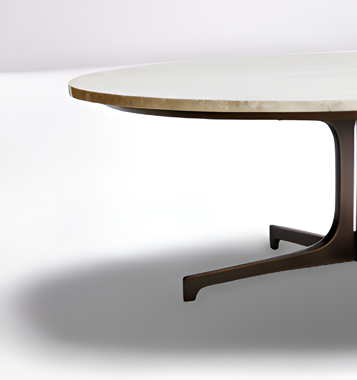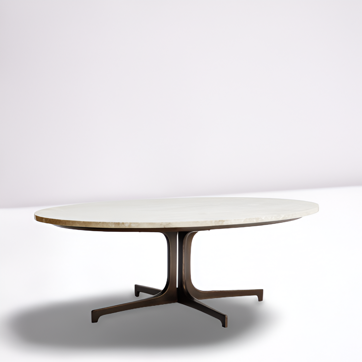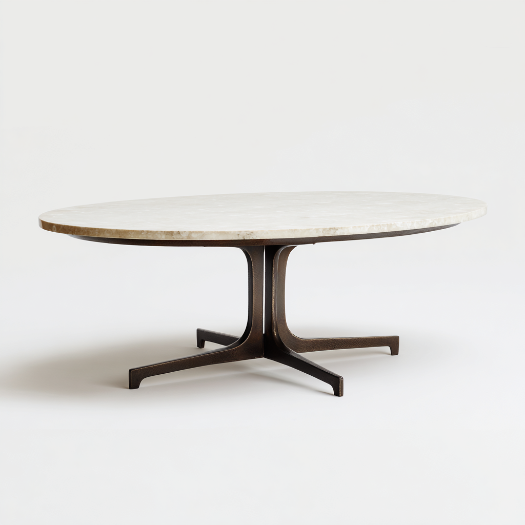 Streamlined form meets enduring craftsmanship in Cervano. The coffee table features an elongated oval stone top in a soft, natural finish, resting gracefully on a sculptural cast-metal base. The intersecting legs create a poised and balanced silhouette, offering both stability and elegance. With its harmonious blend of organic stone and modern metalwork, Cervano embodies understated sophistication.