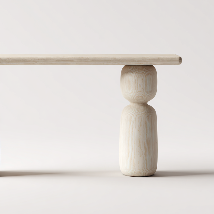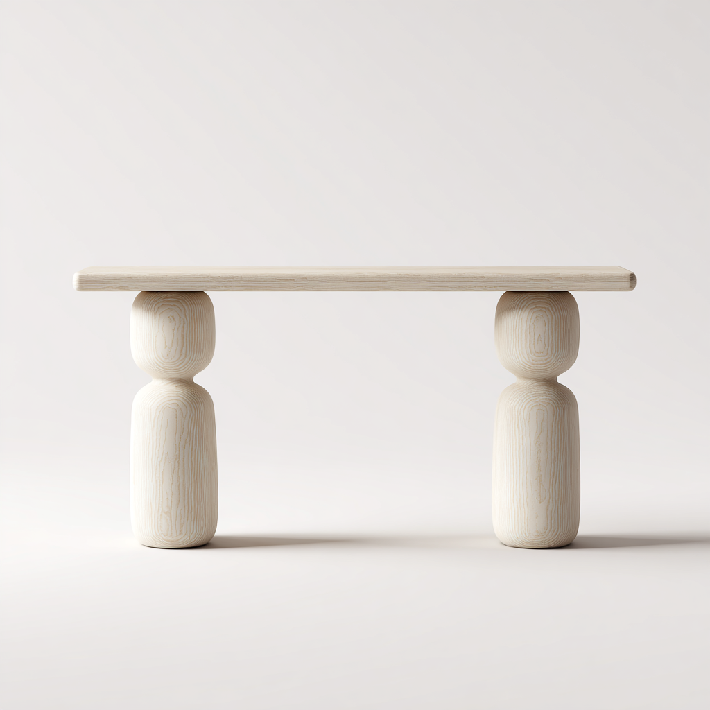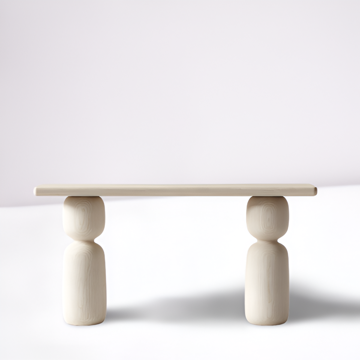 Playful form meets refined minimalism in Elviora. The console table features a slim rectangular top supported by two sculptural, totem-inspired legs. Crafted from solid wood in a soft, pale finish, its rounded forms highlight the natural grain while bringing a sense of warmth and artistry. The design balances simplicity with bold sculptural presence, making Elviora a striking yet versatile accent.