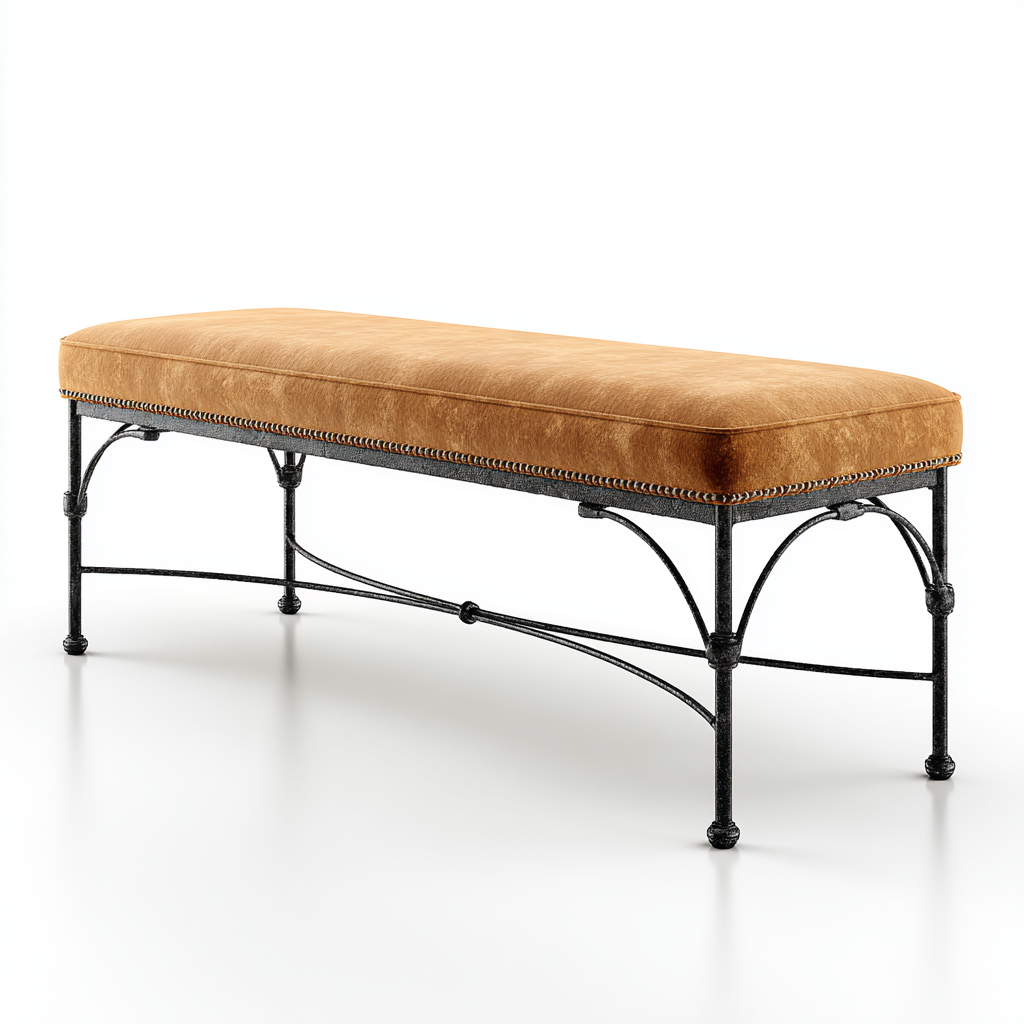 Timeless craftsmanship meets refined simplicity in Ferrenza. The bench features a sleek, rectangular seat upholstered in warm camel-toned fabric, finished with classic nailhead trim for a tailored edge. Its hand-forged iron base, with arched cross supports and subtle detailing, brings an airy architectural presence while ensuring enduring strength. The juxtaposition of soft upholstery and sculpted metal gives Ferrenza an elegance that is both versatile and enduring.