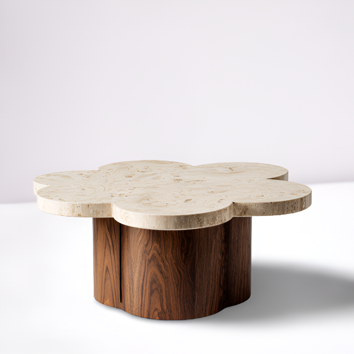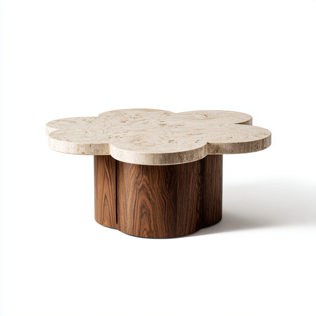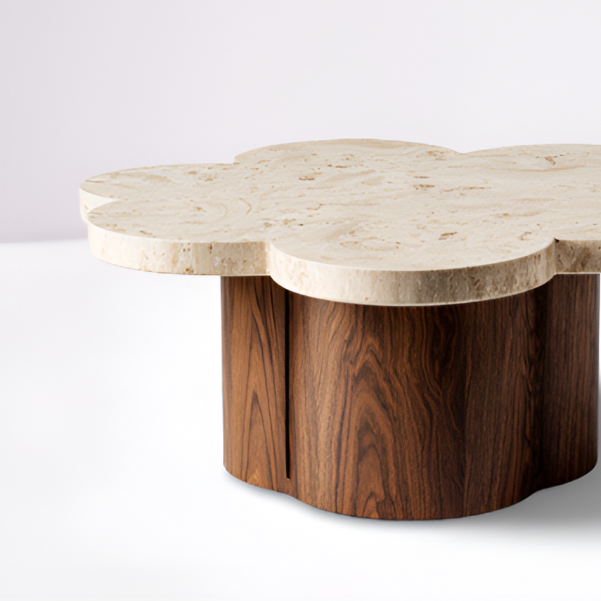 Organic curves meet timeless elegance in Florenzia. The coffee table features a sculptural clover-shaped travertine top, its soft edges and natural stone surface celebrating artisanal craftsmanship. Resting on a cylindrical wood base with paneled detailing, the design harmonizes bold geometry with fluid form. The contrast between smooth stone and rich wood creates a centerpiece that feels both architectural and organic.