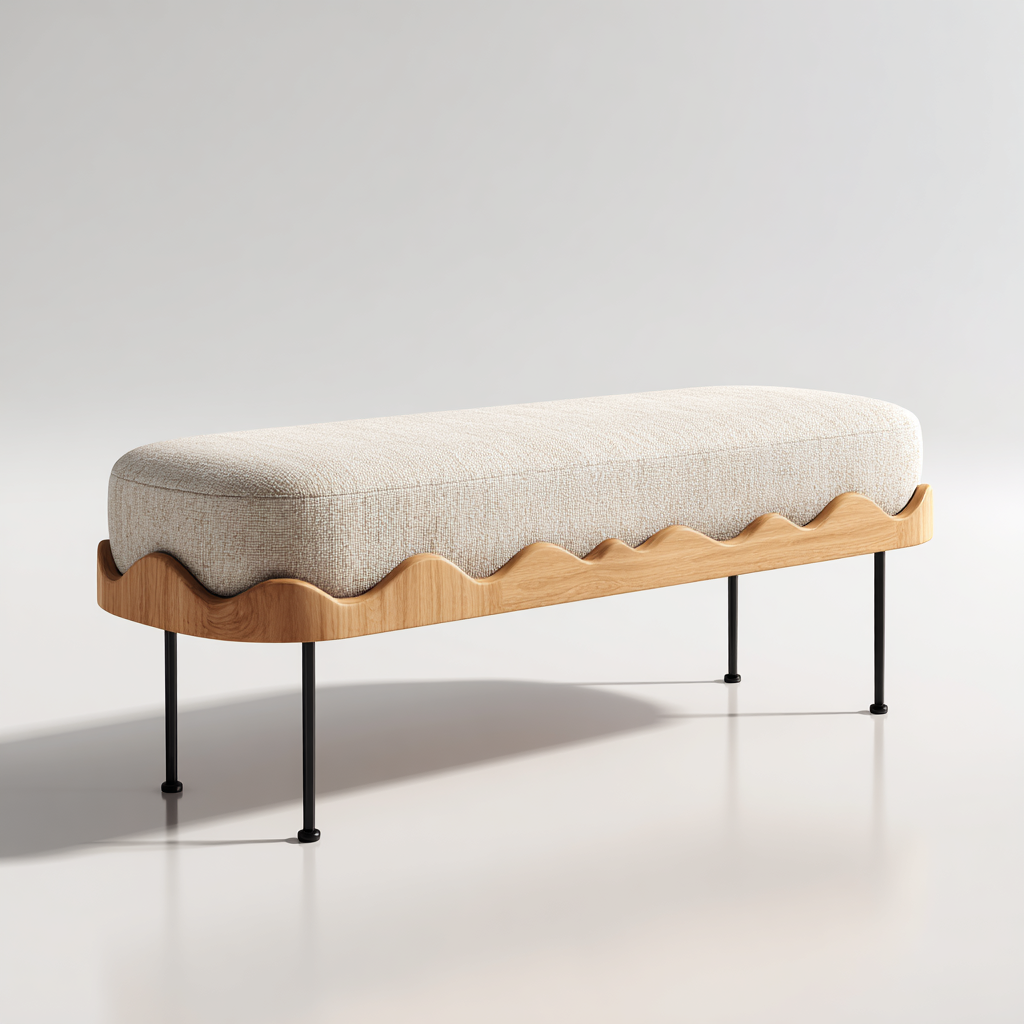 A study in modern whimsy, Ondara blends clean lines with fluid detailing. The plush upholstered seat, wrapped in a soft neutral fabric, rests on a sculpted wooden frame edged with wave-like contours that bring movement and charm to the design. Slender black metal legs lift the piece with an airy elegance, balancing organic warmth with contemporary lightness.