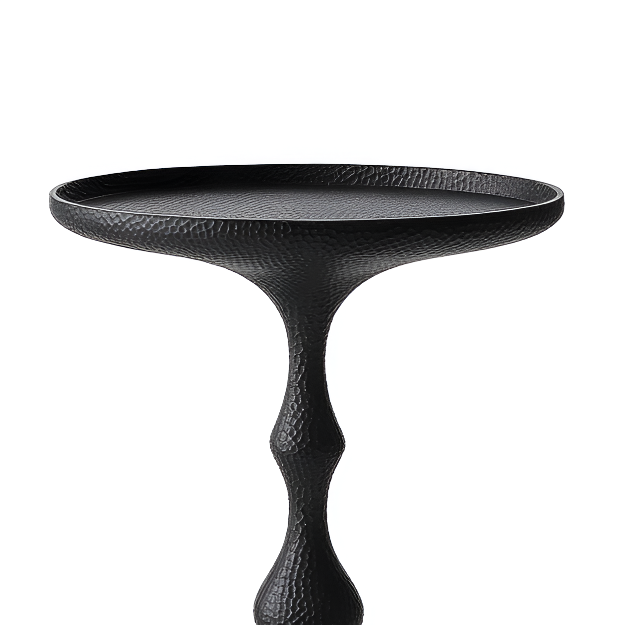 Organic form meets artisanal craft in Osvara. The side table features a slender, sculptural silhouette, hand-forged with fluid curves that flow seamlessly from base to top. Its hammered blackened metal surface adds rich texture and depth, while the raised lip on the tabletop provides both style and function. Bold yet versatile, Osvara is a striking accent that brings artistic presence to any room.