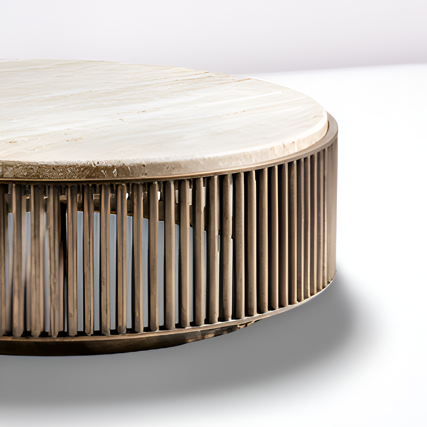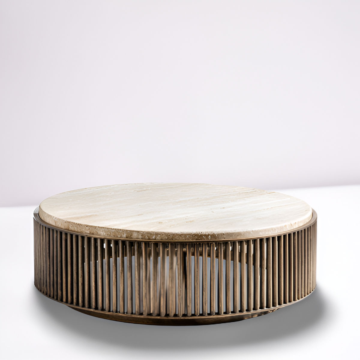 Natural elegance meets rhythmic design in Ravena. The coffee table features a round travertine stone top, elevated by a cylindrical base of finely spaced wooden slats. The vertical rhythm of the base adds lightness and texture, while the stone surface anchors the design with timeless strength. Together, they create a balanced composition that feels both airy and grounded.