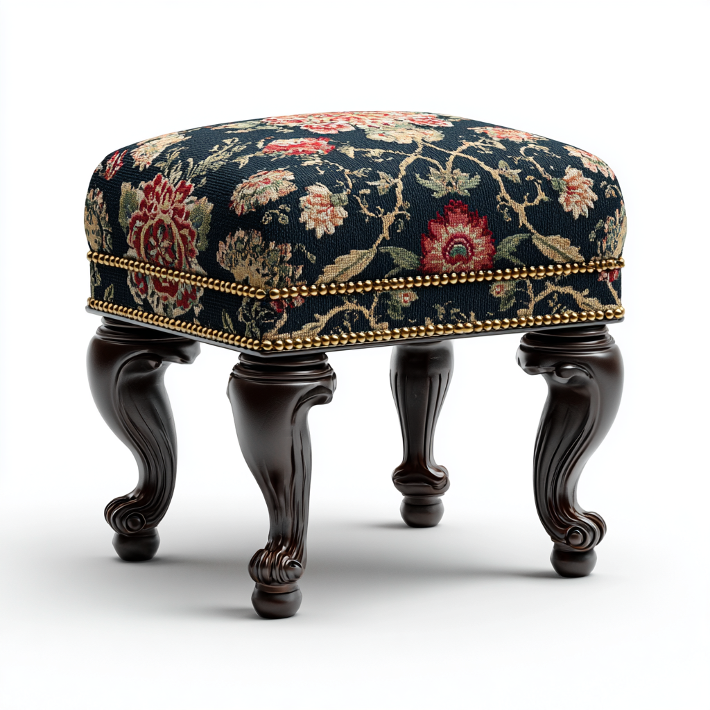 Step into old-world refinement with Regalis. Upholstered in richly patterned jacquard fabric, this ottoman embodies timeless European grandeur. The deep floral motifs in jewel tones are accented by a double row of brass nailhead trim, adding both detail and durability. Resting on elegantly carved cabriole legs in a polished dark wood finish, Regalis exudes a sense of heritage luxury.