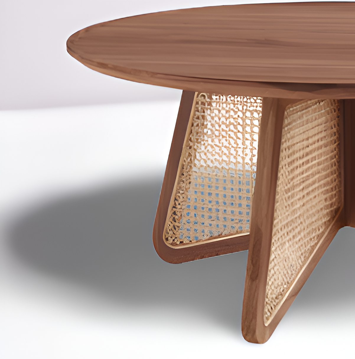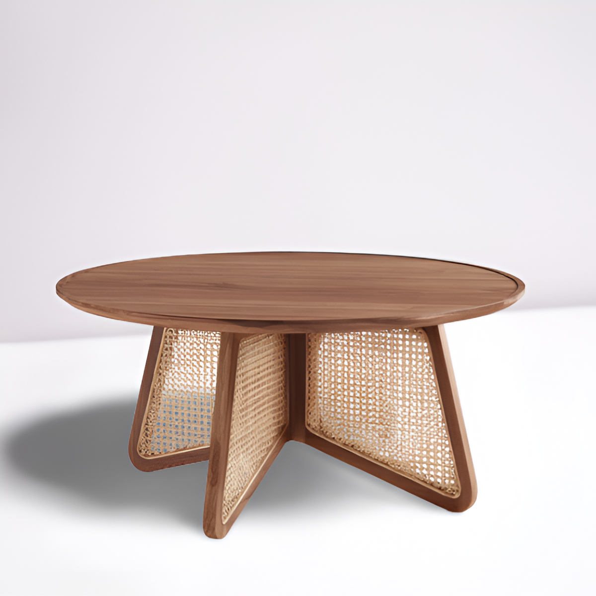 Natural texture meets modern geometry in Serava. The coffee table features a smooth round wood top, balanced on a sculptural base of intersecting panels framed in solid wood and inset with handwoven cane. This interplay of airy weaving and warm wood creates a light, organic presence, while the table’s architectural silhouette adds a touch of contemporary refinement.