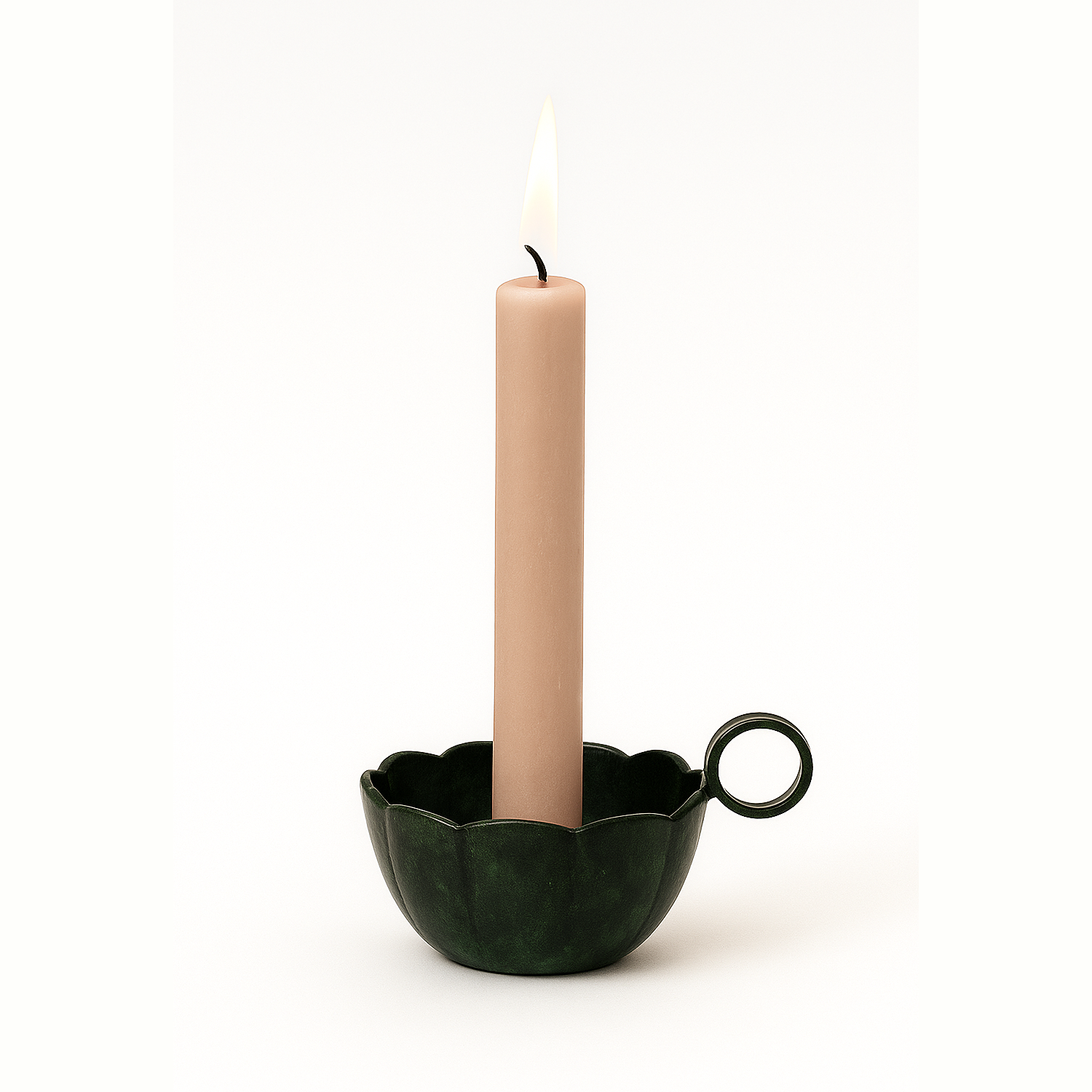 Description The Shadow Bloom Candle Holder draws inspiration from vintage silhouettes, reimagined with a darkly elegant twist. Handcrafted in metal with a soft moss-green patina, it features a scalloped bowl design reminiscent of blooming petals, paired with a circular handle for charm and practicality.
