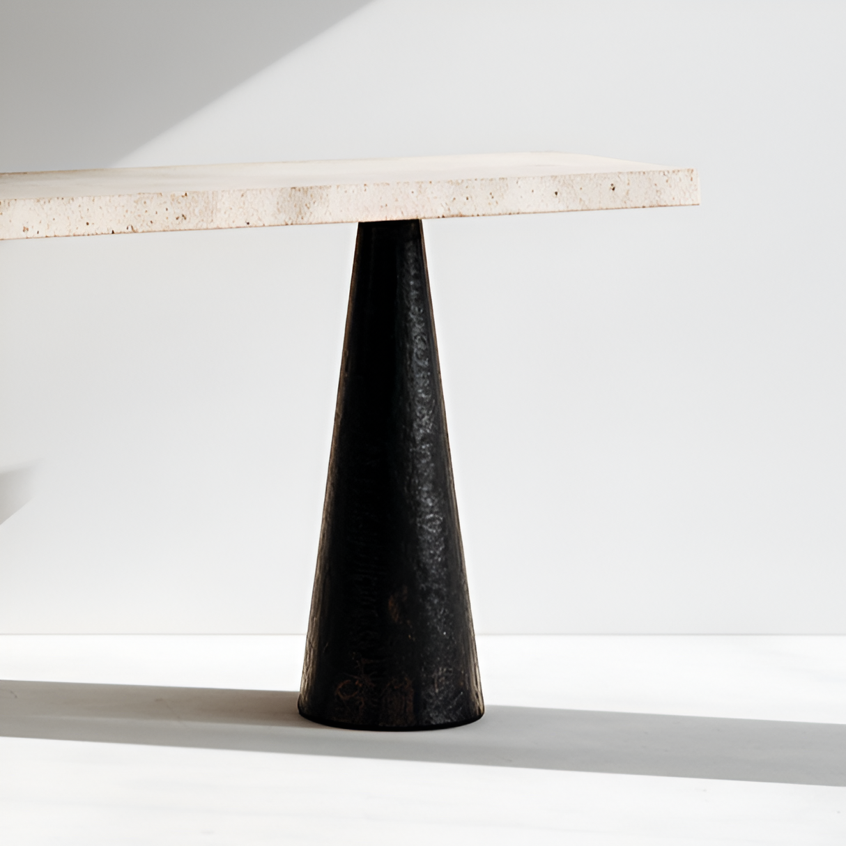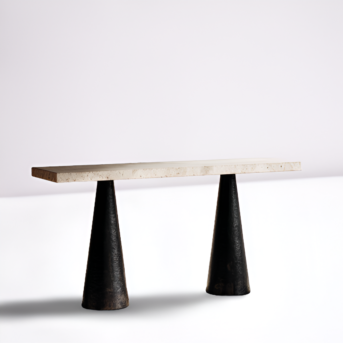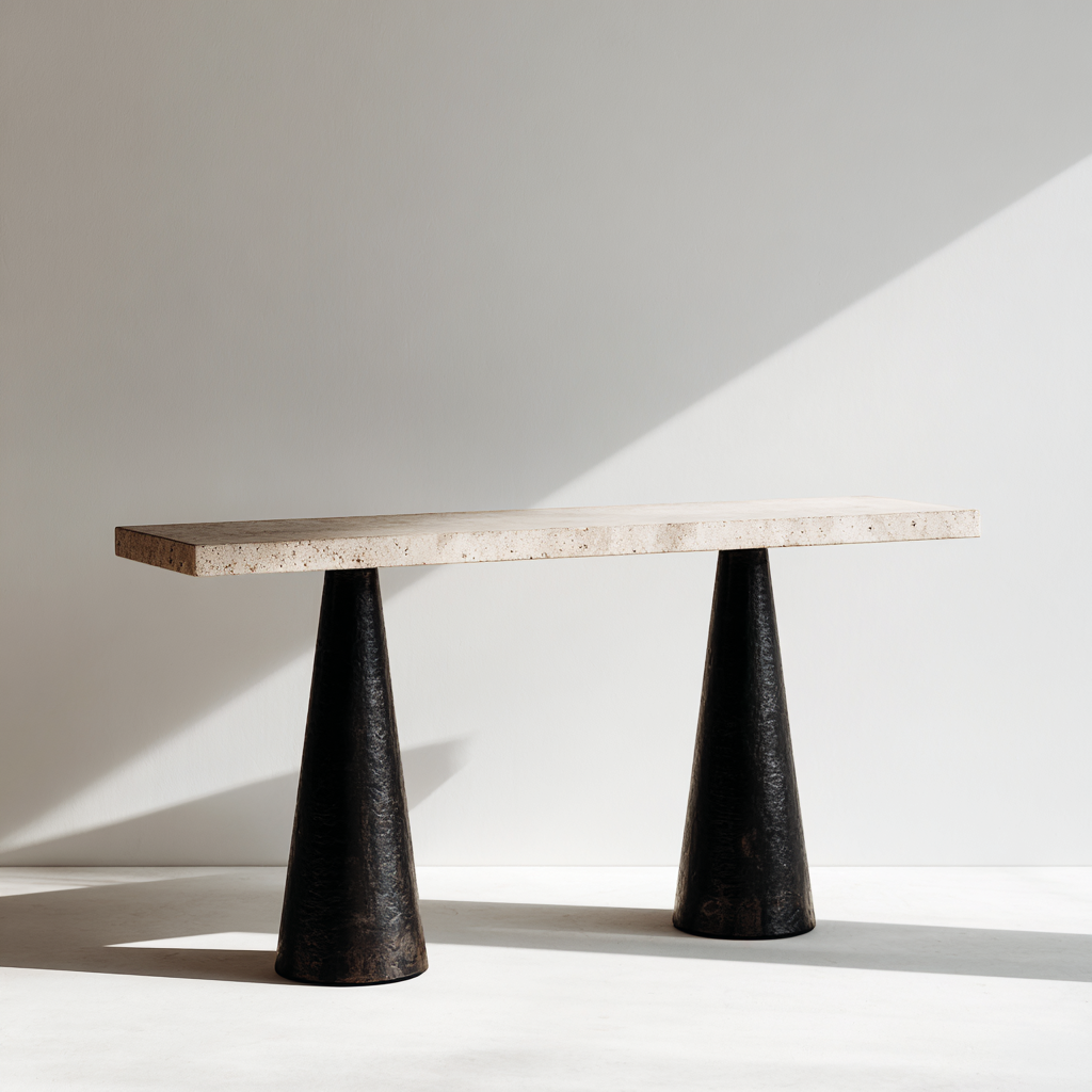 Bold geometry meets refined minimalism in Tavessa. The console table features a substantial rectangular stone top resting on two sculptural conical bases, hand-finished in deep black for a striking contrast. The design highlights the balance between raw materiality and modern form, with the solid stone surface softened by the elegant taper of the base. Tavessa embodies quiet strength and architectural sophistication.
