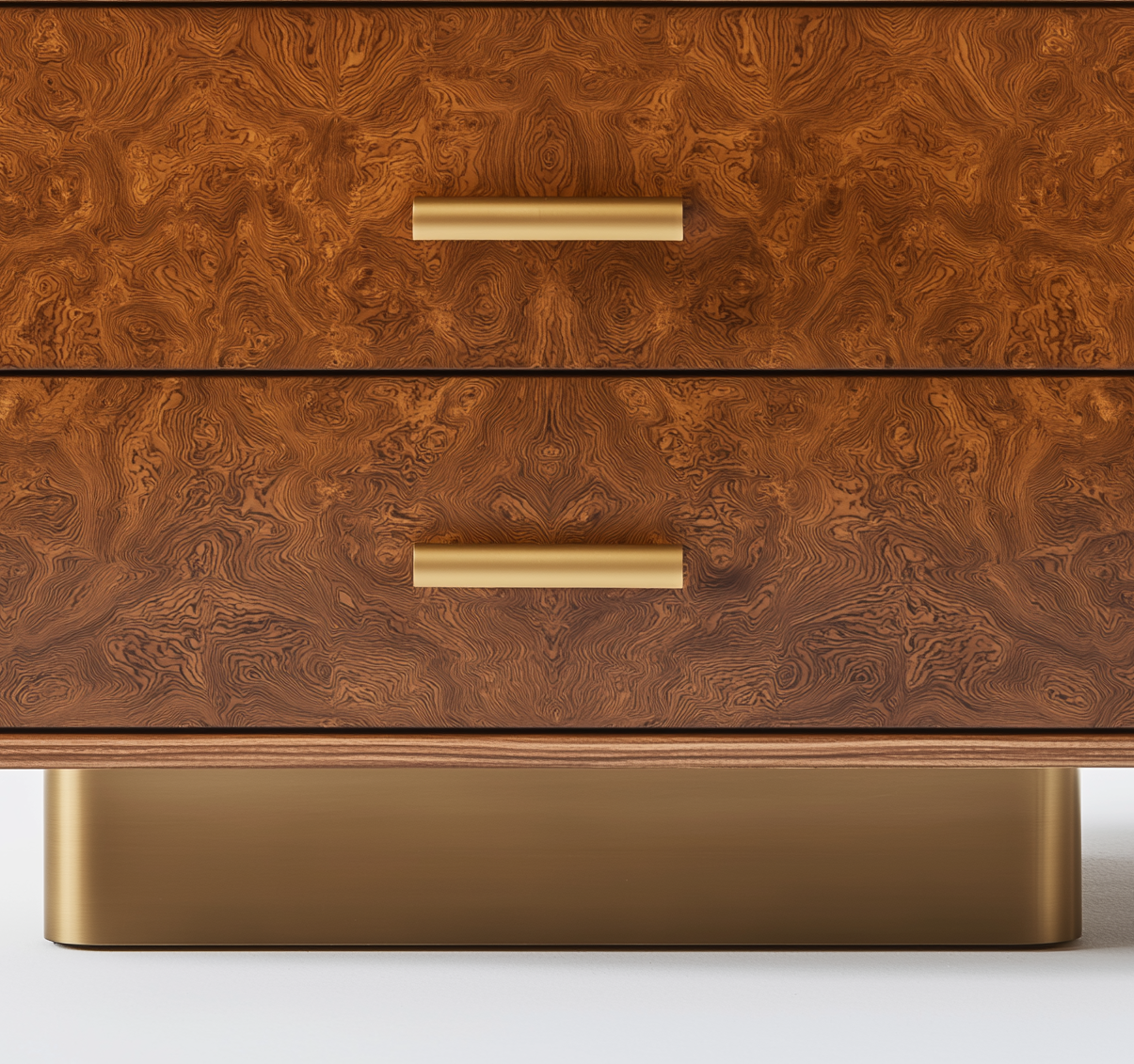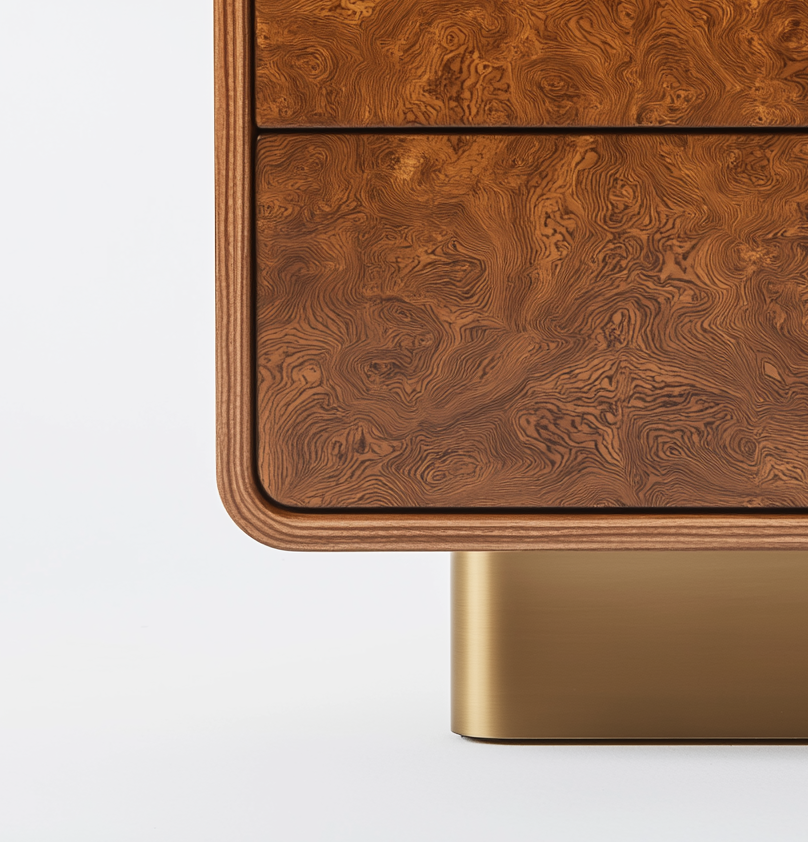 The Aurelia Burl Nightstand is an exquisite blend of organic beauty and modern luxury. Featuring a rich burl wood veneer with captivating natural patterns, this piece radiates sophistication. The rounded edges and smooth contours offer a refined, contemporary appeal, while the brushed gold base and handles add a touch of opulence. Designed with two spacious drawers for effortless organization, this nightstand is a perfect fusion of style and functionality. Whether placed beside a plush bed or styled as a statement accent, Aurelia elevates any interior with timeless elegance.