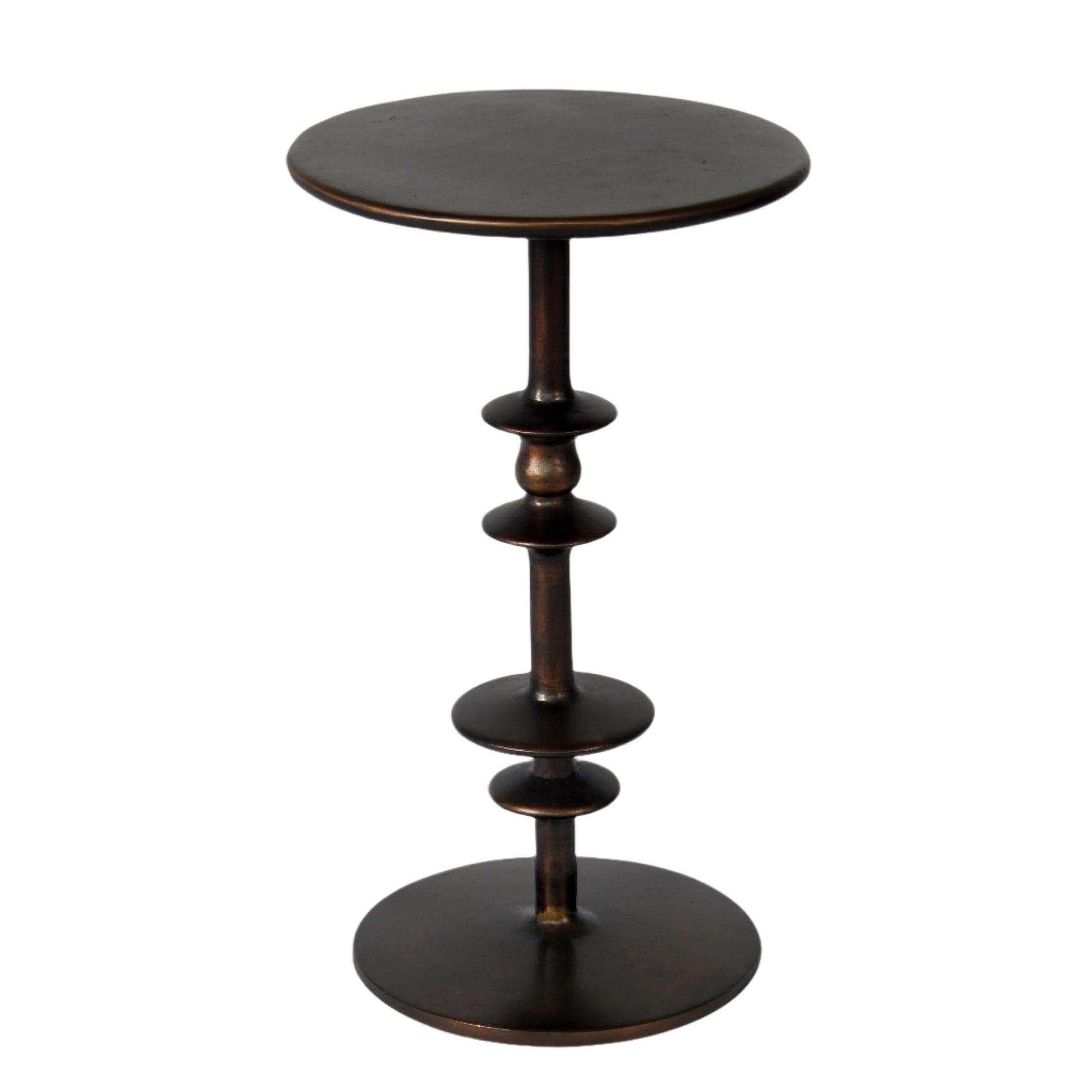 Handcrafted in a rich, antiqued brass finish, the table exudes warmth and sophistication. The round table top provides a functional yet artistic surface, making it perfect for holding drinks, decorative pieces, or a stylish lamp. Whether placed beside a sofa, next to a lounge chair, or as a standalone accent, this table adds a touch of refined elegance to any interior.