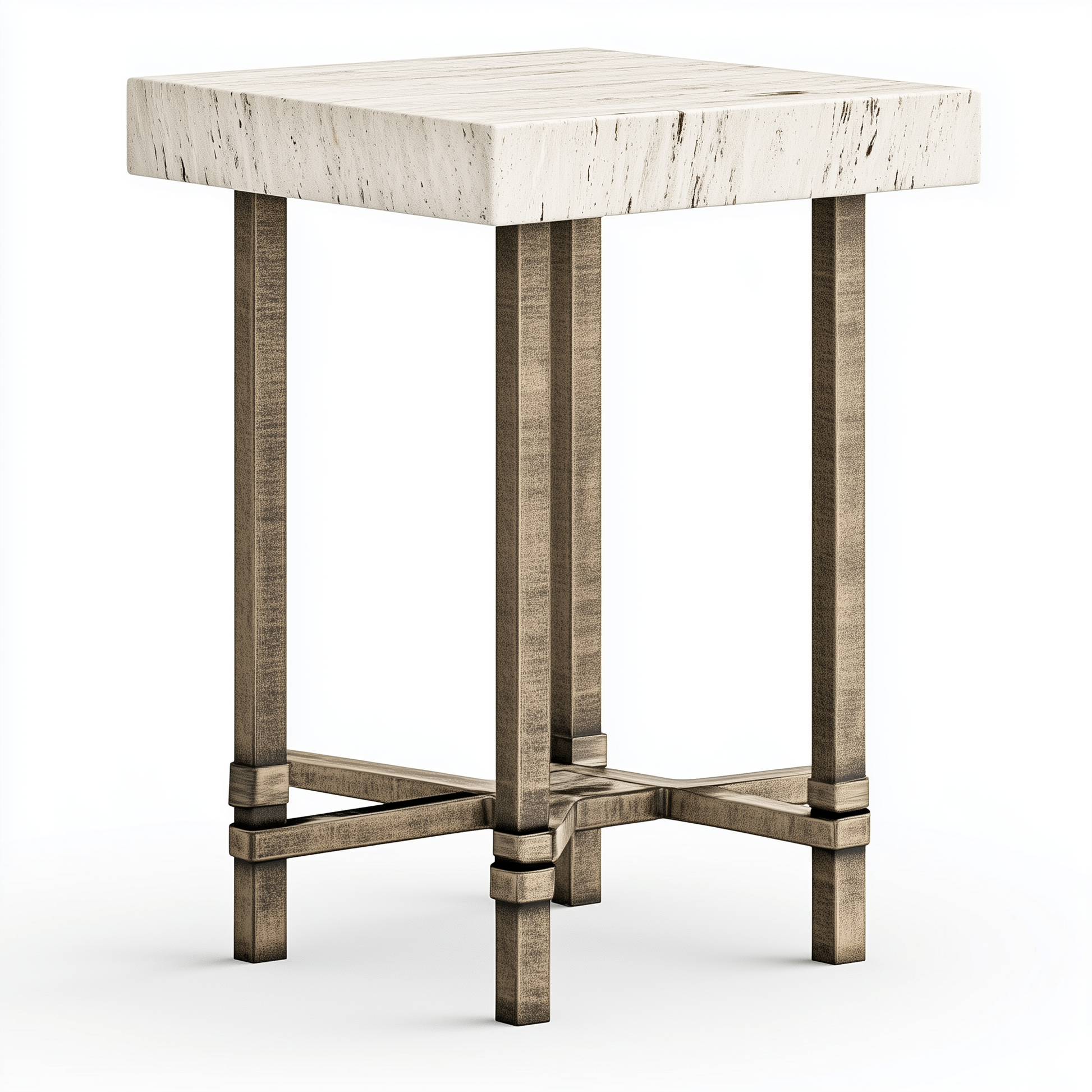 Elevate your living space with the perfect fusion of natural beauty and modern craftsmanship. This stunning end table features a solid white travertine top, carefully selected for its organic texture and timeless appeal. Supported by a sleek yet structured satin brass base, the design exudes understated luxury while ensuring stability and durability. The geometric silhouette and refined materials make this piece a versatile addition to any interior, whether used as a side table in a contemporary living room or a chic accent in a bedroom. Designed to blend sophistication with functionality, this table brings an effortless charm to any curated space.