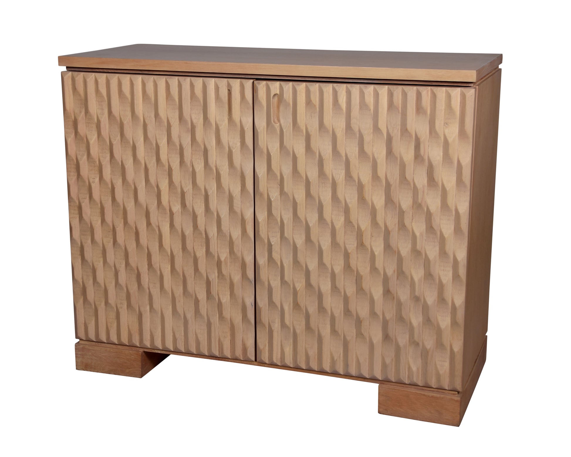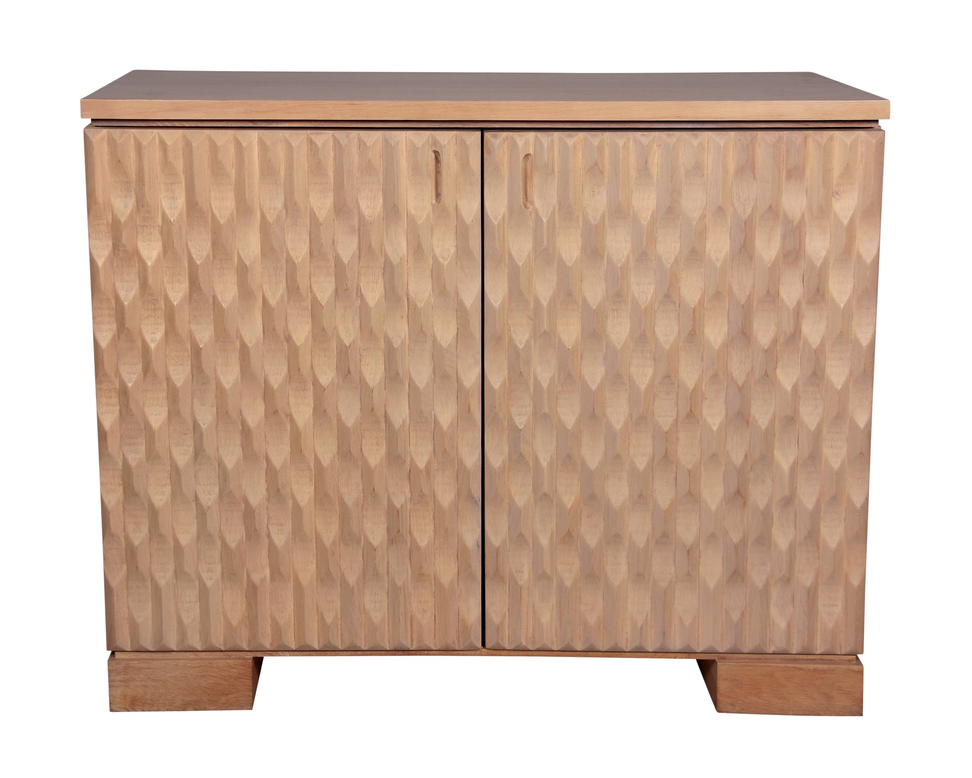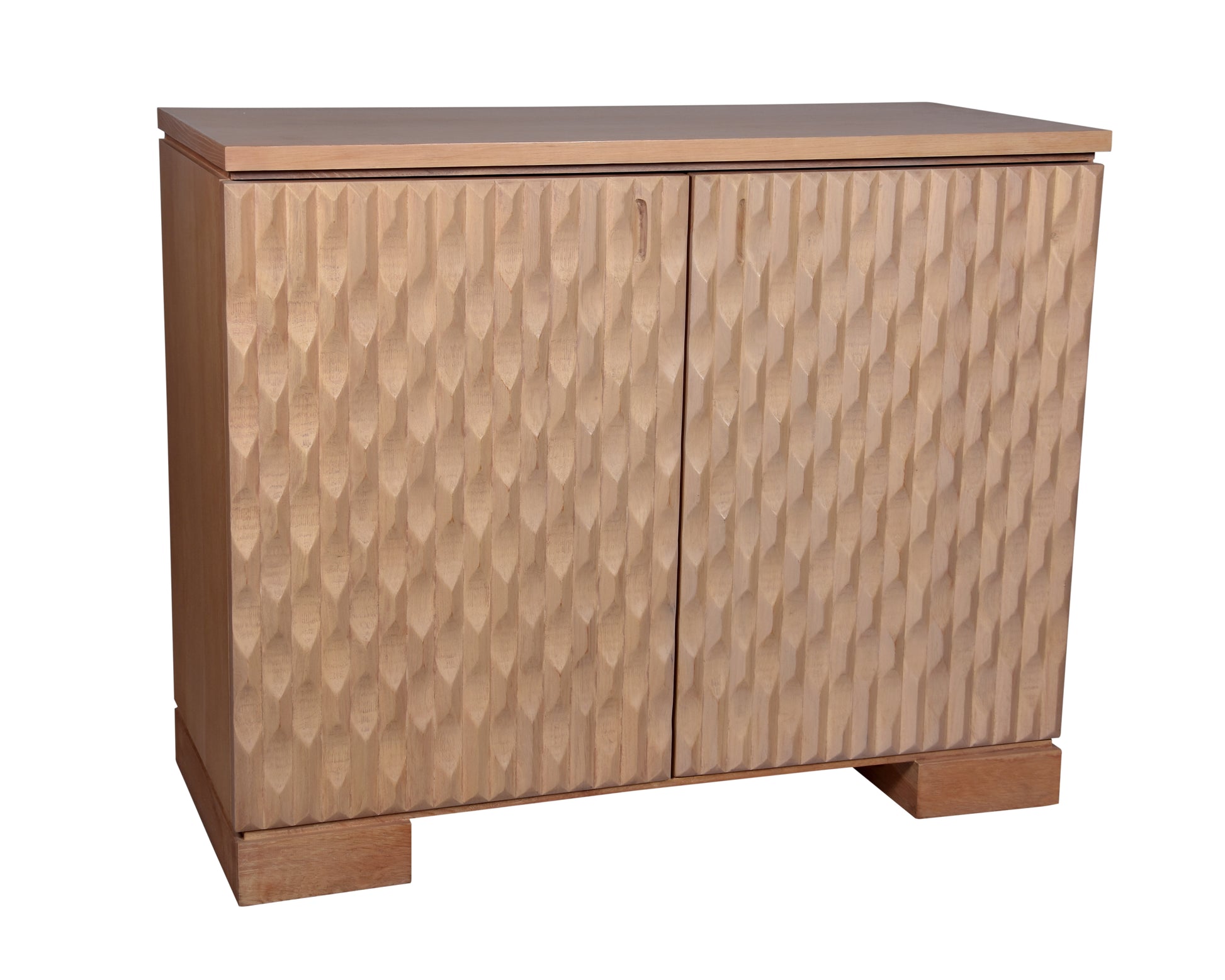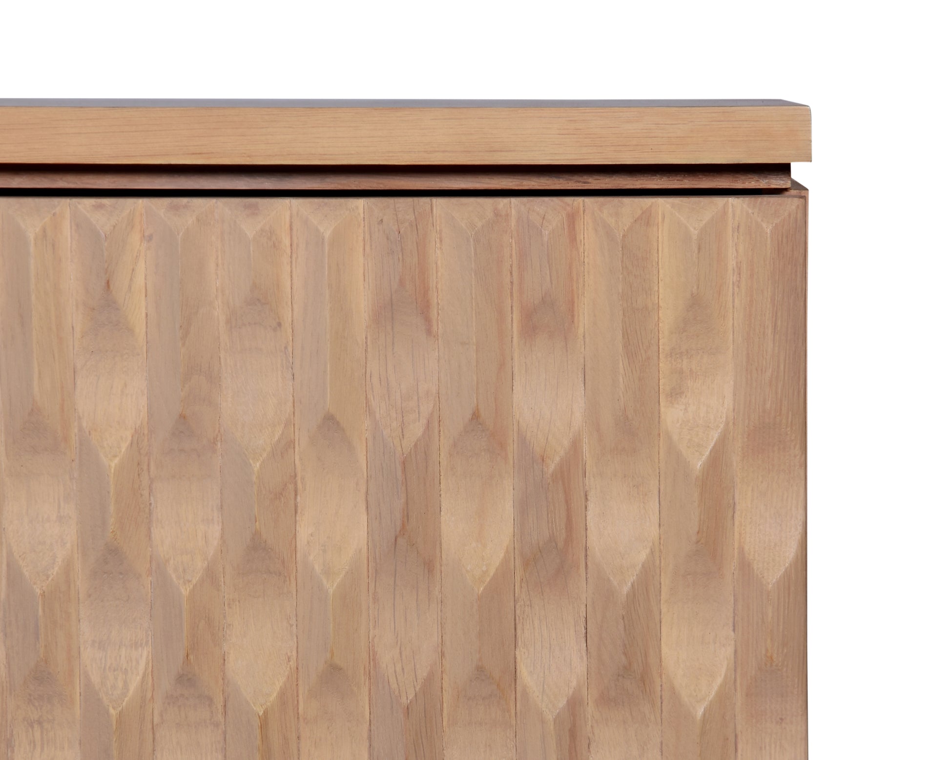 Crafted from premium solid wood, this cabinet ensures durability and long-lasting beauty. The symmetrical door design features subtle recessed handles that seamlessly integrate into the textured pattern, enhancing the minimalist yet sophisticated aesthetic.