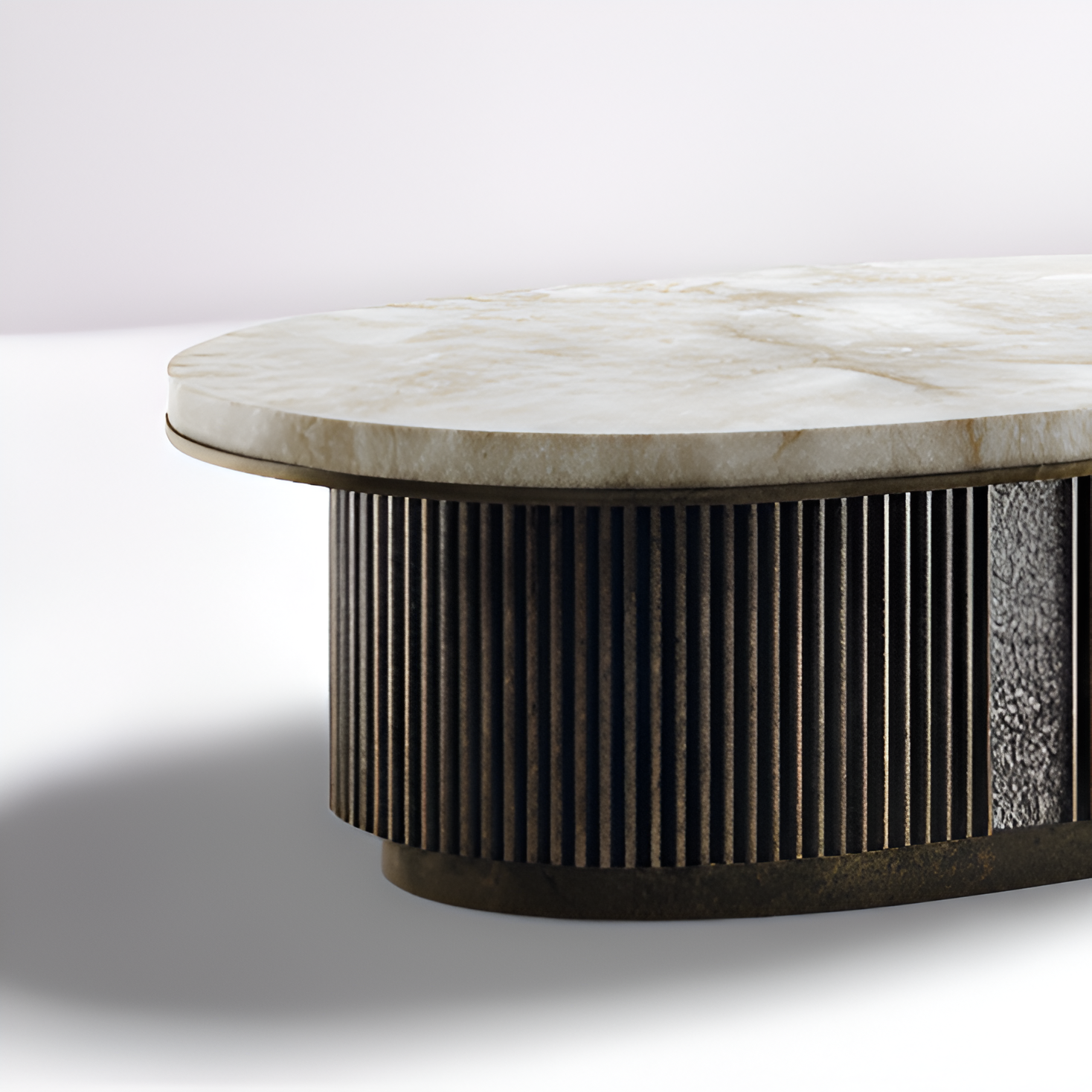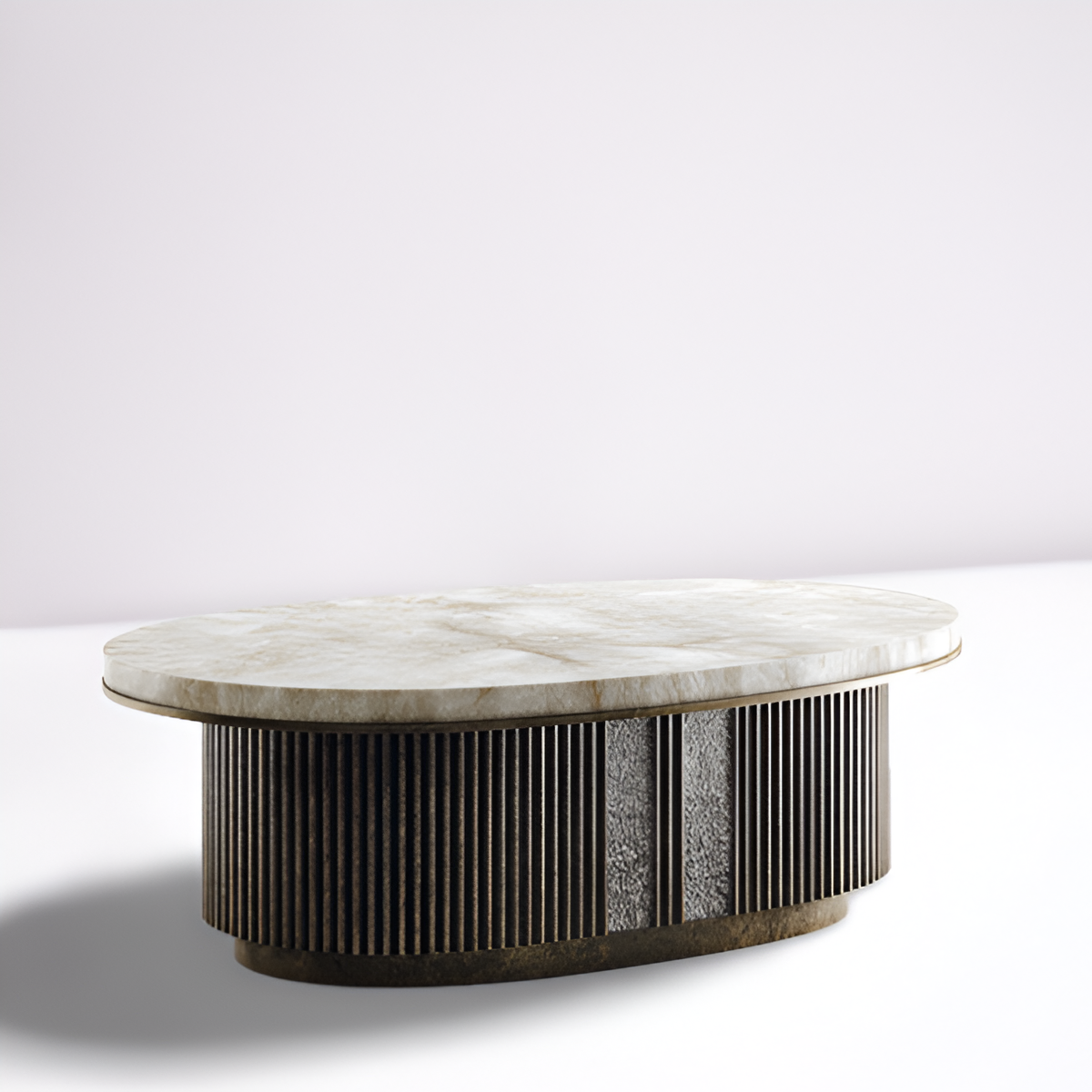 Refined luxury meets architectural detail in Valtieri. The coffee table features an elongated oval stone top, its luminous surface offering both durability and sophistication. The sculptural base, wrapped in vertical fluting with inset textured panels, adds depth and dimension while grounding the design with timeless elegance. The interplay of smooth stone and rich, rhythmic detailing creates a statement piece that feels both modern and enduring. Perfect for anchoring a seating area with quiet grandeur, Valtieri lends artisanal strength and contemporary refinement to any interior.