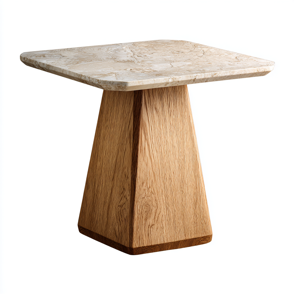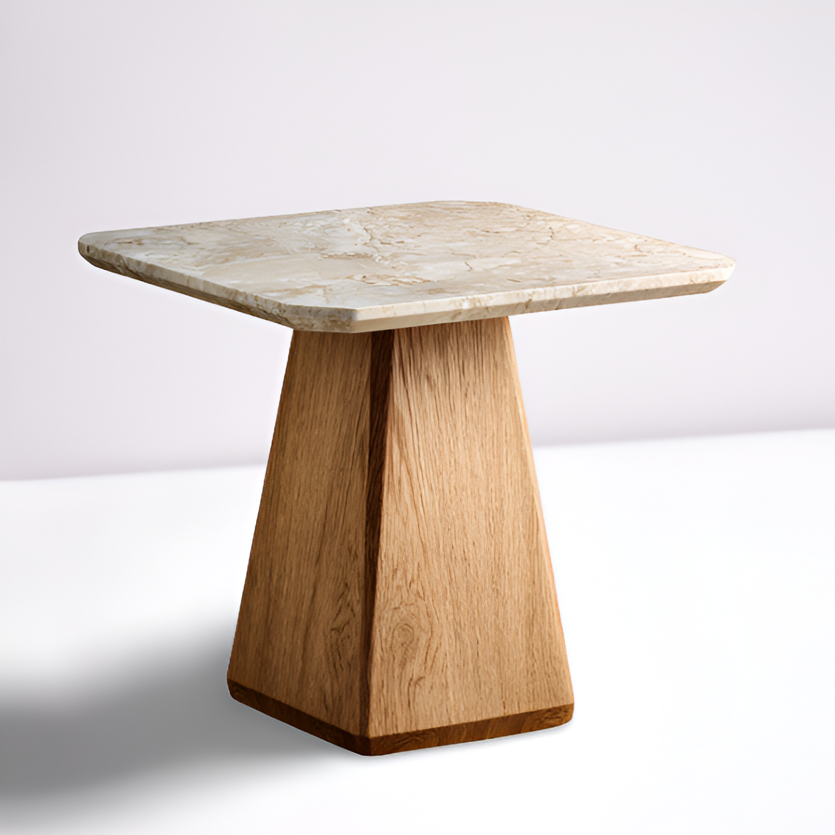 Geometric clarity meets natural elegance in Varetta. The side table features a square travertine top with softened edges, showcasing the stone’s organic veining and subtle tonal variation. Its faceted wood pedestal base adds architectural presence, grounding the piece with warm texture and strength. The combination of stone and wood creates a harmonious balance between refinement and solidity.
